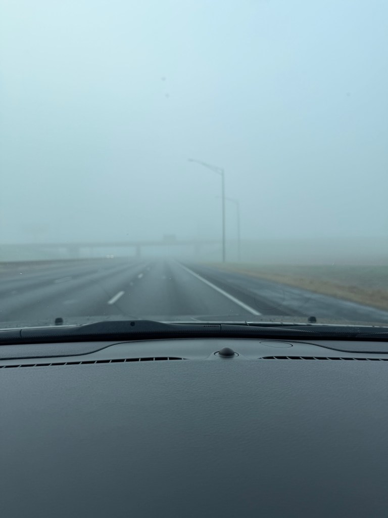 We were up and ready and as soon as I backed out of the garage, I commented on how thick the fog was. Ten miles in….still thick. Twenty-five miles in….still thick. All the way to her dorm…..extra thick.